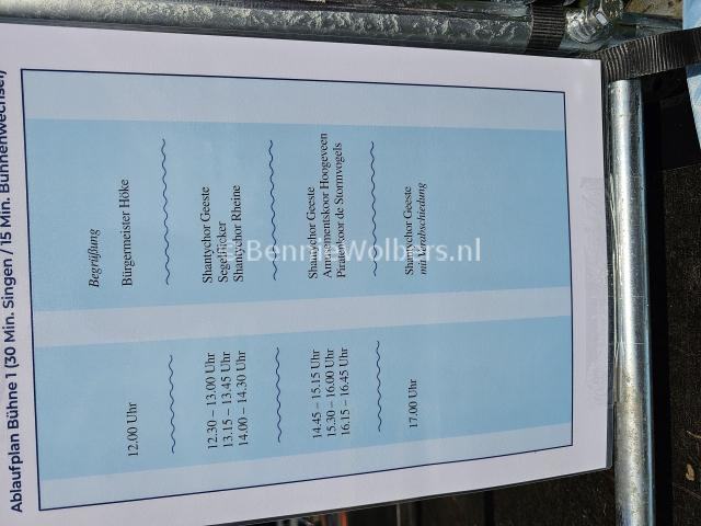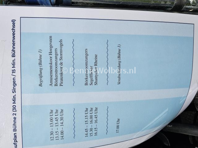 Desondanks hebben wij genoten van de drie Nederlandse en drie Duitse koren die er optraden. Naast de organiserende vereniging Shantychor Geeste stonden er verdeeld op twee podia Die Borkerstroomzangers uit Westerbork, Piratenkoor De Stormvogels uit Emmen, Amusementskoor Hoogeveen, Die Siegelflickers uit Hiddenhausen en Shantychor Reine 2013.