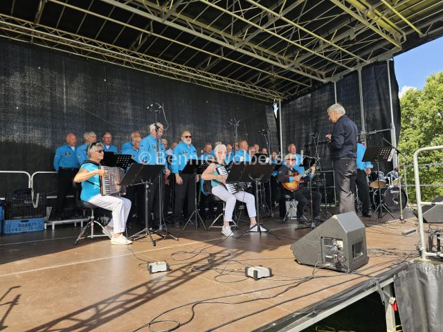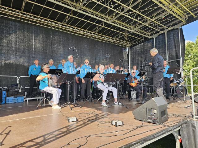 Tijdens het festival was er rond de Scheichersee ook de gehele dag nog een grote Flomarkt om even tussen de optredens door te lopen. Dat hebben wij niet gedaan, want wij moesten ook nog weer terug fietsen. Daardoor hebben wij ook het altijd weer de imposante afsluiting met samenzang van allee koren op één podium. Met een tussenstop in Kiek in de Pan in Twist arriveerden wij weer voldaan na en dagje fietsen van in totaal ruim 90 kilometer weer op de basis, met de aantekening dan het weer een geslaagde dag was en er ook in 2026 ijs en weder dienden ook zeker weer bij zullen zijn. Zie ook het fotoboek.