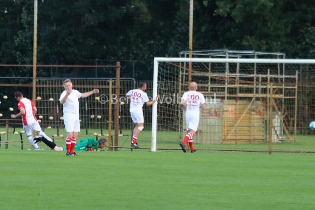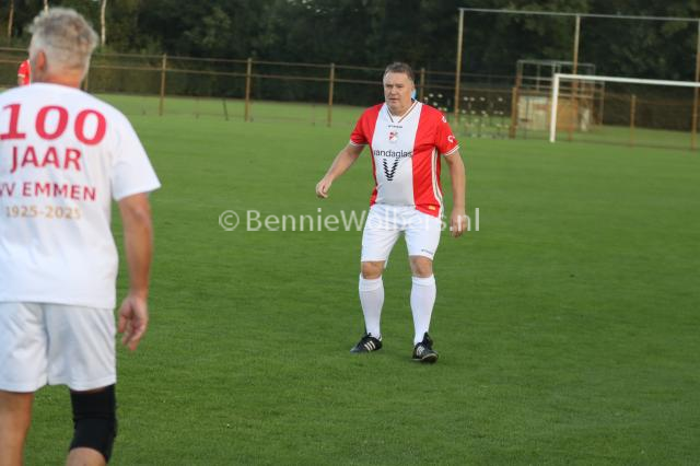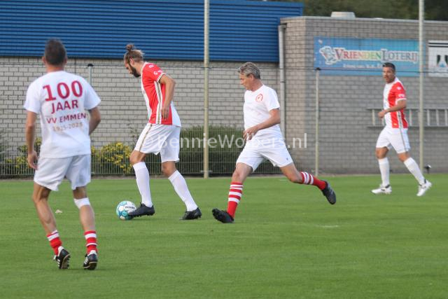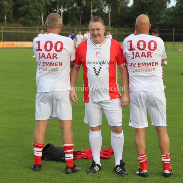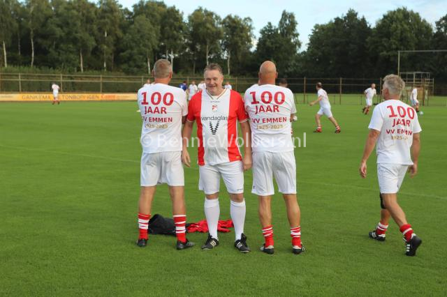 EMMEN - Voetbalvereniging Emmen vierde op 21 augustus jaar 100 jarig jubileum. In het kader van 100 jaar werd op zaterdag 23 augustus, s avonds vanaf 19.00 uur een op voorhand een bijzondere jubileumwedstrijd gespeeld op het hoofdveld van de vv Emmen op sportpark Meerdijk tussen oud vv Emmen en oud FC Emmen.