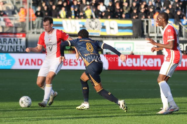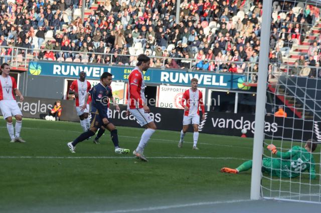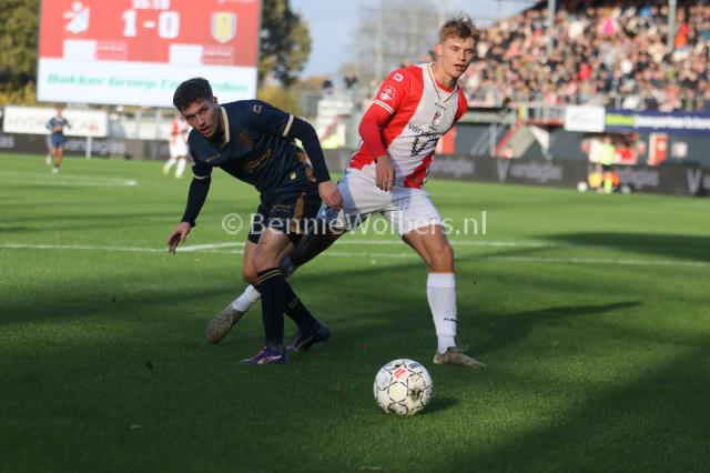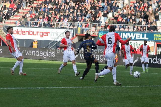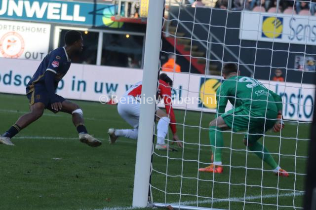 In de 22e minuut kwam FC Emmen toch op voorsprong. Na slordig uitverdedigen bij de bezoekers pikte Alaa Bakir de bal op, dribbelde richting zestien en legde breed op Adam Claridge. De Deense middenvelder haalde verwoestend uit en liet doelman Mark Spenkelink kansloos: 1-0.